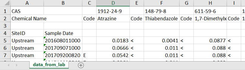 It is common for environmental chemistry data to come back from the laboratory in a “wide” format. A wide format typically has a few “header” columns such as site and date with additional columns representing a single chemical per column and possibly a remark code for each chemical as a separate column. The remark column could indicate censored data (ie “below detection limit”) or some information about the sampling conditions.